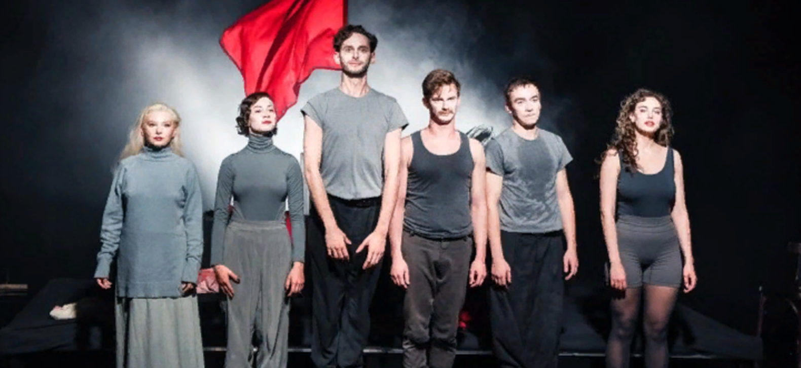 Спектакль выполнен в жанре так называемой советской Комедии Дель Арте, которая подчеркивает агитационное и пародийное звучание текста. Мы выстроили на театральной сцене вторую сцену-трибуну, входя на которую артисты играют своих шестерых персонажей, находящихся в поиске волнующего их предмета - знамени. Но куда стремится эта советская карикатура, в чем она похожа на современность и где границы гротеска и искренности… Зритель станет свидетелем.